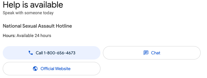 Yes. Search engines provide two types of messaging for concerning queries: signpost and deterrence. Signpost messaging offers the first search result as a hotline or helpline so that the user can get the support they need. Here is an example of a signpost message that Google provides when I type in “sexual violence.”