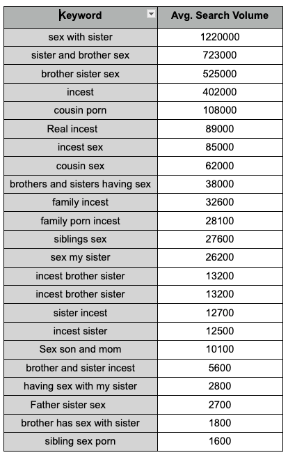 In all cases, what the internet has done and continues to do is be a pro-incest propaganda space, where those who want to talk about incest openly do, and the conversations most often claim consent and not abuse. It would be far too easy to accuse an outspoken anti-incest activist like me of hyperbolizing this story to draw attention to this issue that has deeply impacted my family, my community, and me. So I encourage you to try it yourself. In order to help you, I have supplied a table of the most searched for incest-related keyphrases in the past year that I pulled from the software Mangools.