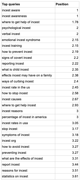 The first Incest AWARE website was launched by a friend and fellow activist Suzanne who sought to create one of the only anti-incest platforms on the internet at the time. When Suzanne retired, I took over the website and the growing organization. As a Search Engine Optimization (SEO) content strategist and writer, my goal was to ensure that Incest AWARE’s pages ranked within the first five search results for any anti-incest related keyphrases, or those seeking support, information, and resources. Below you can see the first 29 of many anti-incest related queries, as well as where Incest AWARE’s pages rank on average within SERPs results.